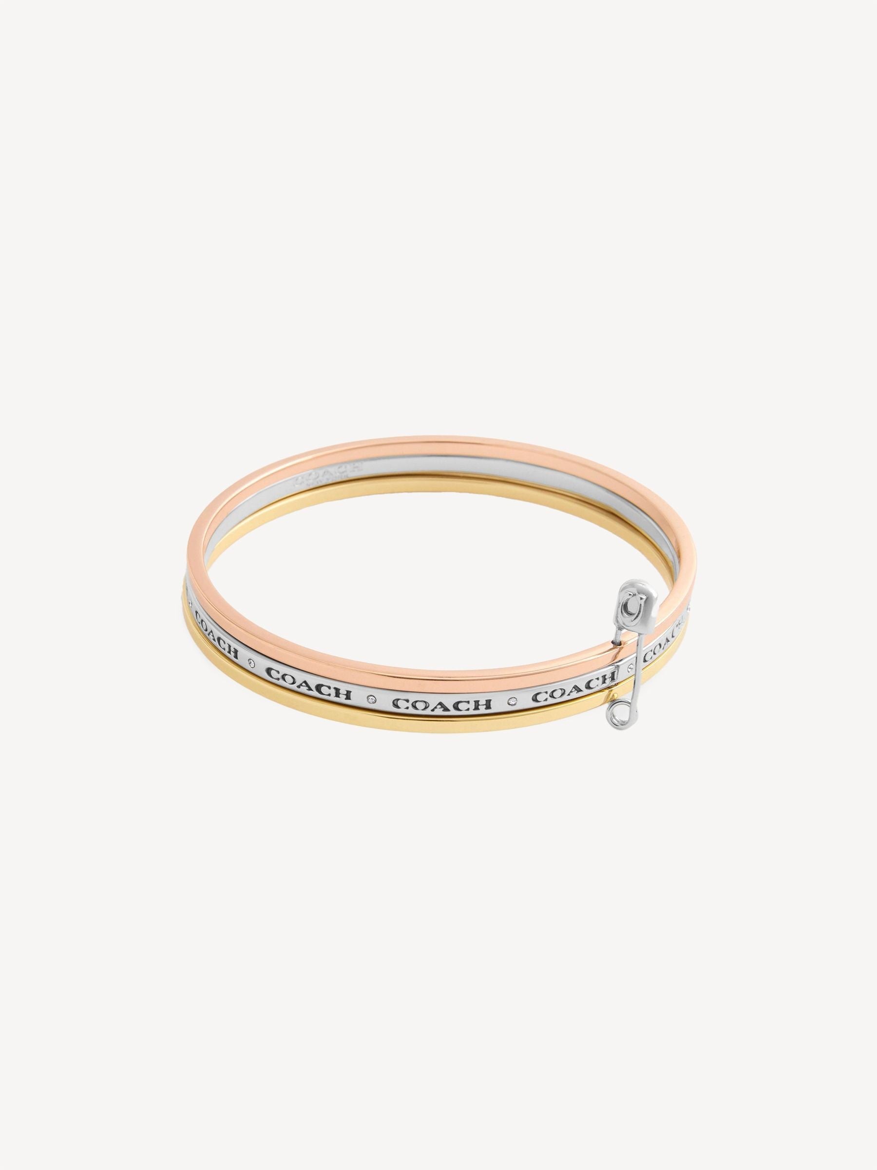 Sophisticated bangle bracelet set featuring signature logo, minimal crystal stones, and attached by playful safety pin hardware adorned with sculpted C motif. Set includes 3 bangles set in neutral tri-tone finish, perfect for everyday.