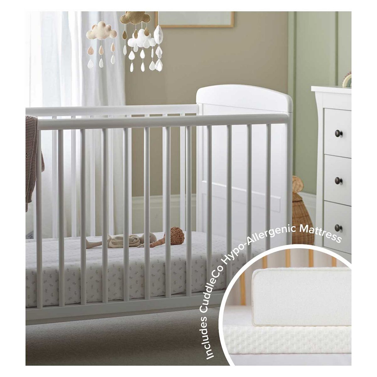 The Juliet cot bed expertly made by hand in Europe. A simple and classic design made especially for any nursery. The Juliet cot bed has 3 adjustable heights from newborn to toddler, eventually converting into a toddler bed as your child grows. Featuring our signature tongue and groove design on the headboard and safety teething rails to help soothe your little one when teething keeps your cot bed in the best condition. Made with solid pine and board the Juliet cot bed offers exceptional quality at a great price. Including our Cuddleco Lullaby Foam mattress, its superior quality foam inner makes this mattress fully breathable, fully washable and anti microbial. Our Lullaby mattress features two unique sides, one side features our signature bamboo fabric that has natural hypoallergenic and anti-microbial properties helping to maintain a germ free cleaner environment, whilst the reverse side showcases our easy clean waterproof training layer, ideal for those first potty training days. Designed to care designed to last.