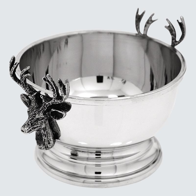This stag pewter nut bowl is handcrafted in Sheffield from the finest pewter, which will not rust or lose its lustre over time. The bowl is decorated with two pewter stag head badges. It comes beautifully packaged in a presentation box and protective bag.