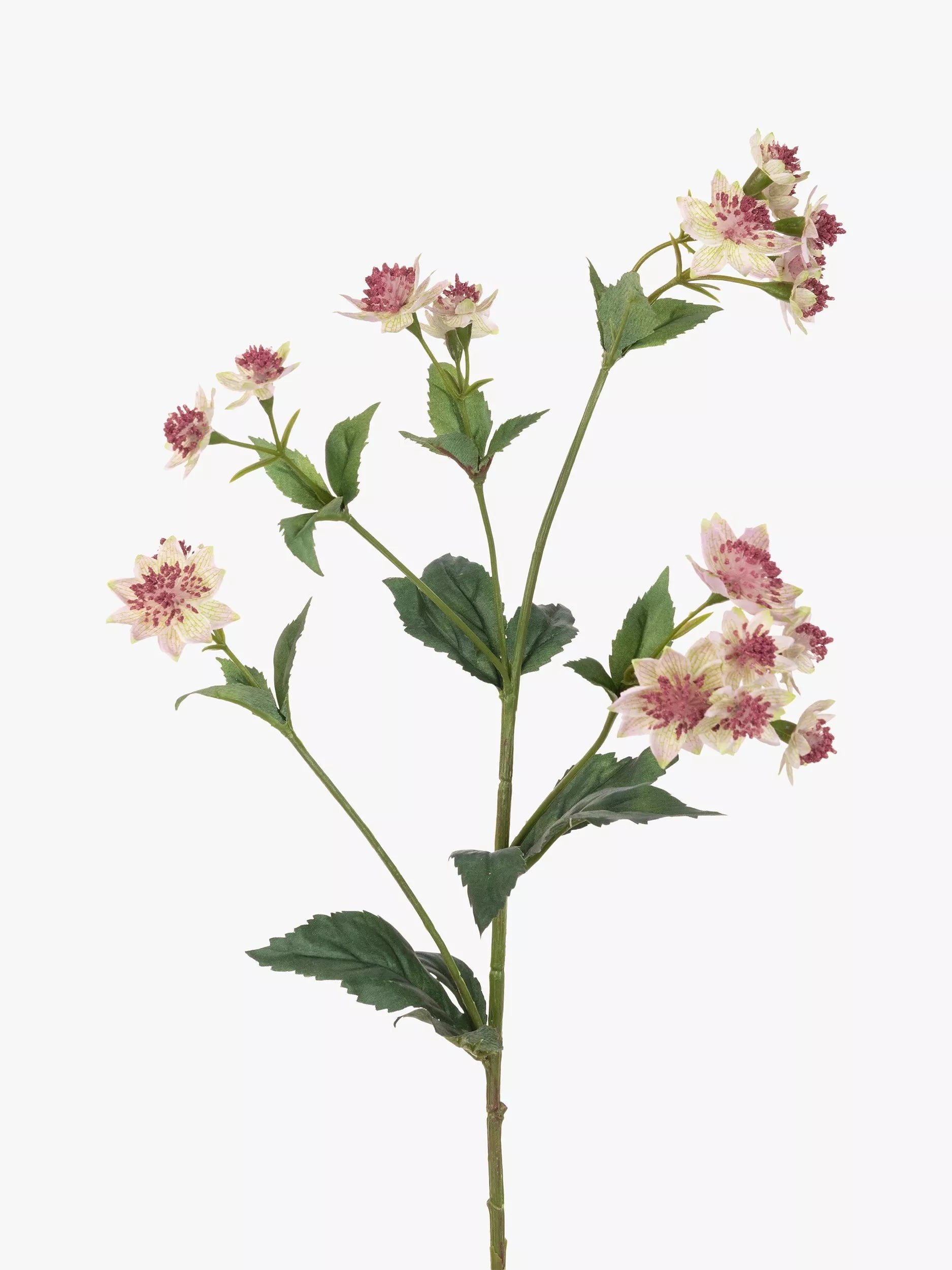 Artificial astrantia spray. Place multiple stems in a vase to create a standalone display or combine with other floral stems to create your own bespoke arrangement. The wired stem can be cut or bent to achieve the desired length.