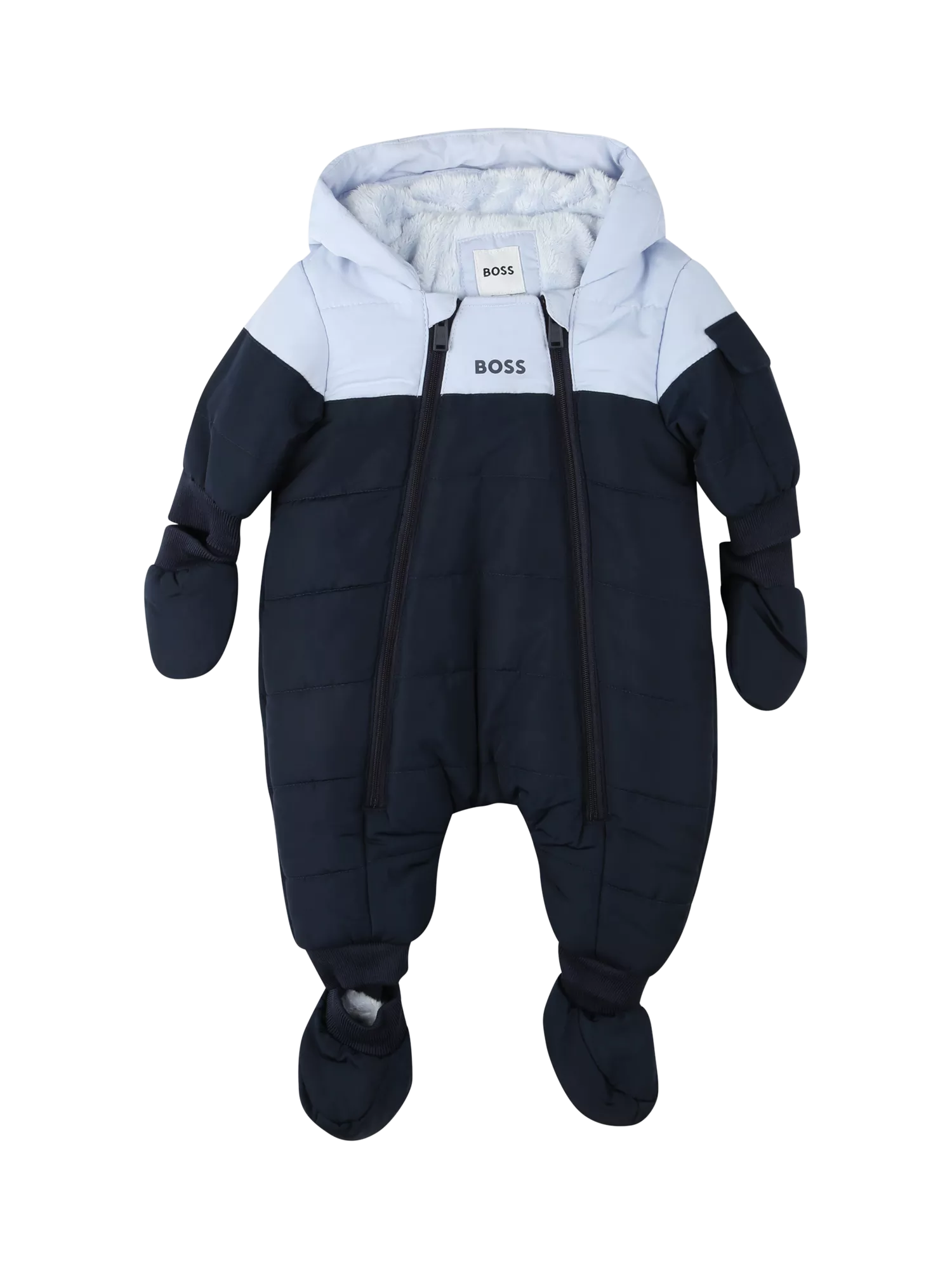 This snowsuit is lined with cosy faux fur. Designed with a contrast hood, double zip closure and removable mittens and booties. Finished with Boss branding.