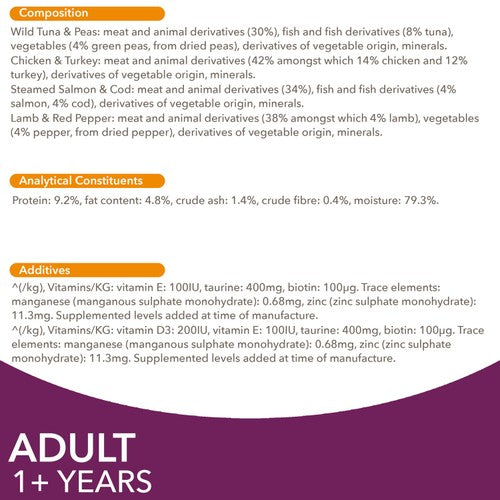 Wild Tuna & Peas: meat and animal derivatives (30%), fish and fish derivatives (8% tuna), vegetables (4% green peas, from dried peas), derivatives of vegetable origin, minerals. Vitamins/KG: vitamin E: 100IU, taurine: 400mg, biotin: 100μg. Trace elements: manganese (manganous sulphate monohydrate): 0.68mg, zinc (zinc sulphate monohydrate): 11.3mg. Supplemented levels added at time of manufacture.