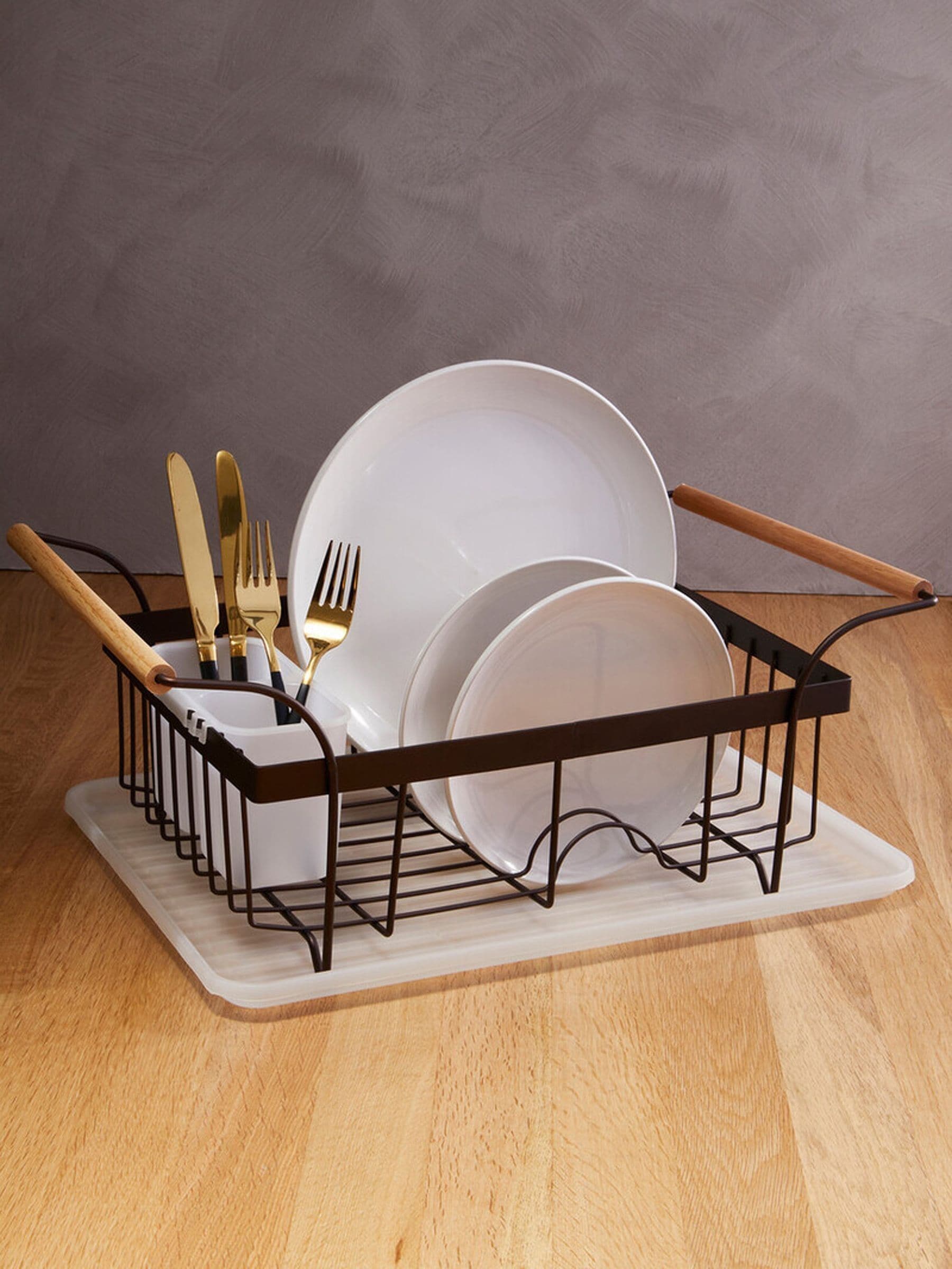A contemporary dish rack and tray combination with rich metal and natural wood accents.