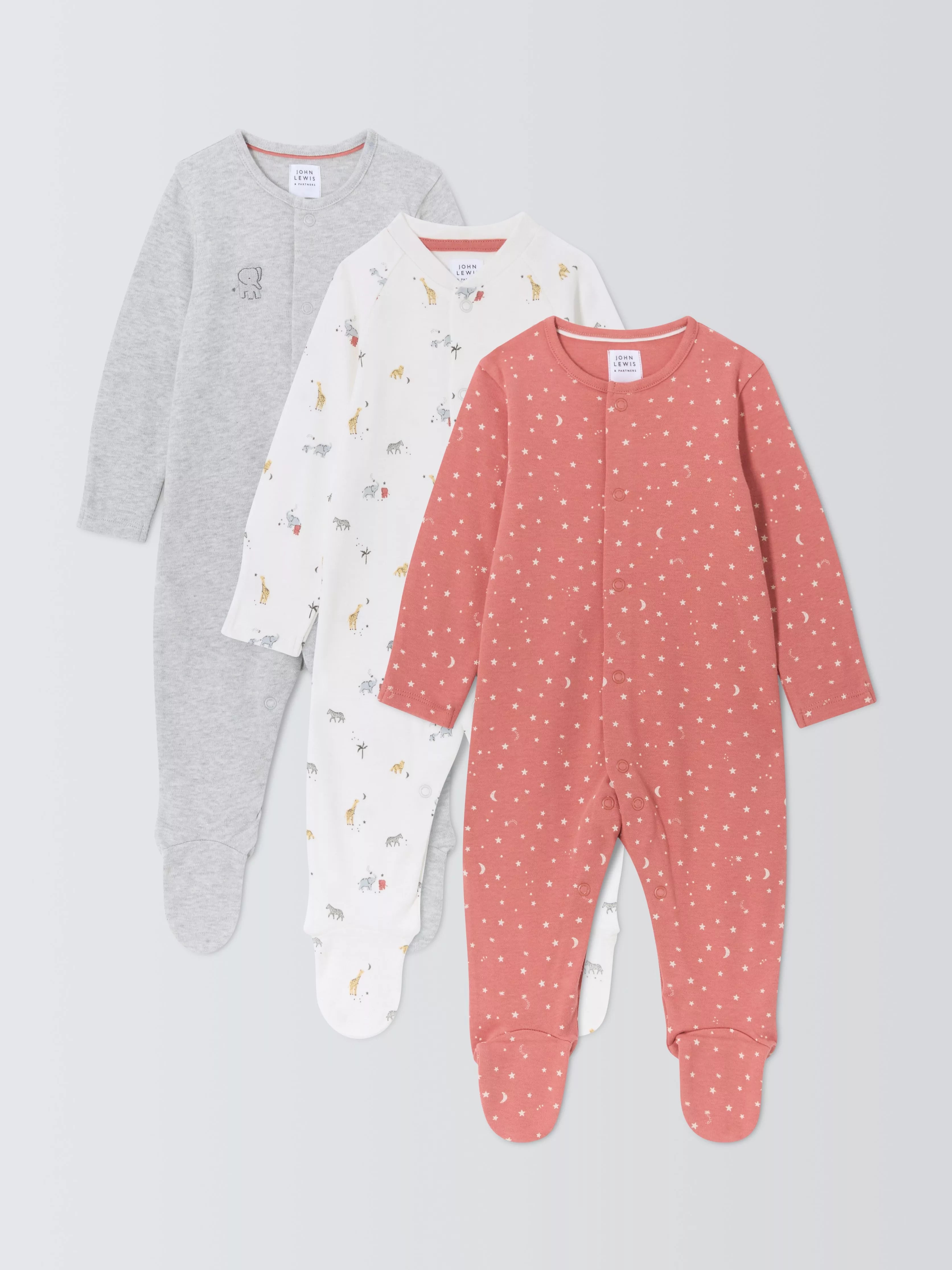 Dress your little one in ultimate comfort with this adorable 3-pack of John Lewis baby sleepsuits. Made from soft, breathable 100% cotton, these sleepsuits are perfect for delicate skin. Featuring charming safari animal and star prints, they're a must-have for any parent.