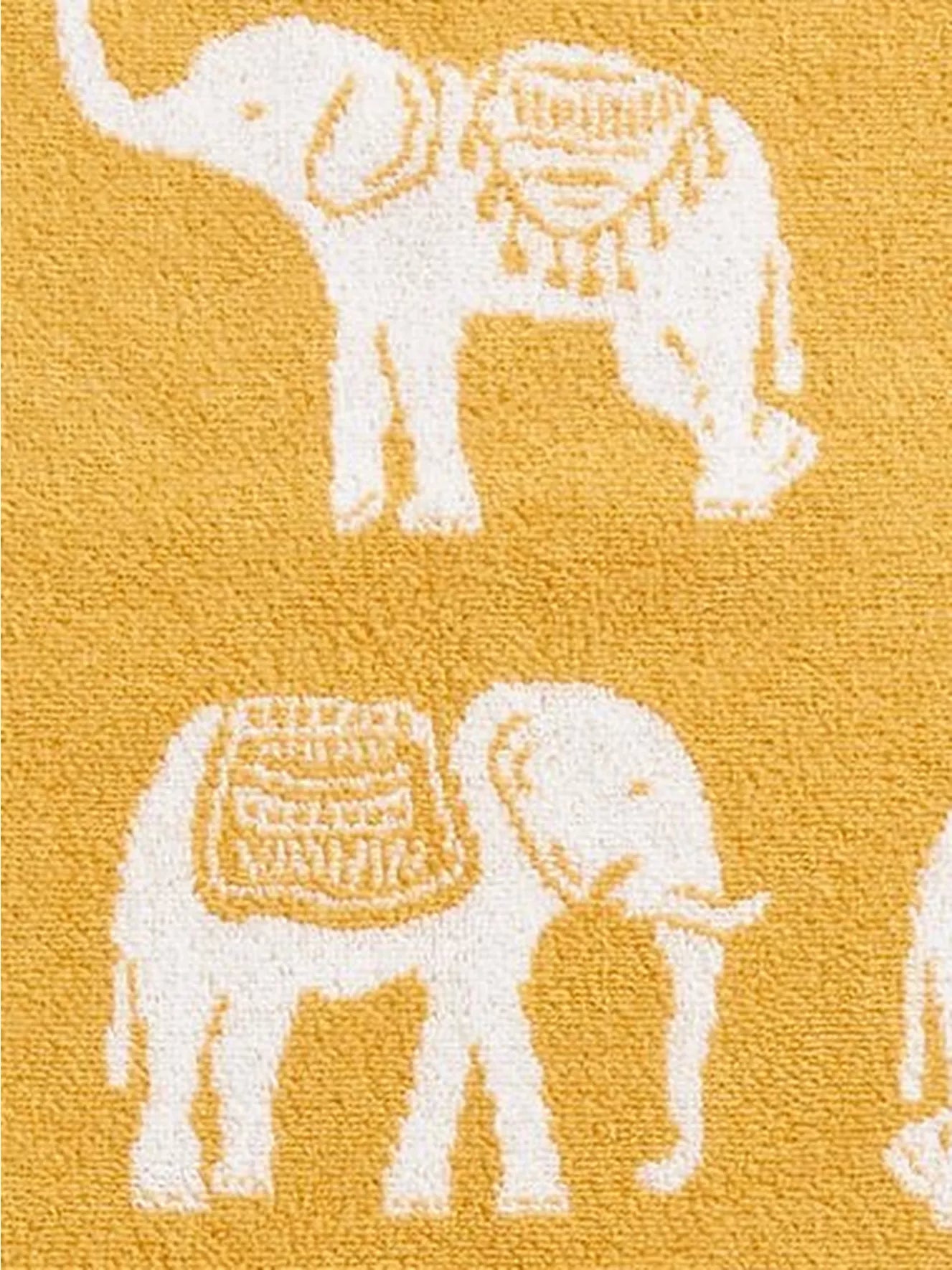 These cotton towels feature a charming motif of elephants in costume, ready to go on parade.