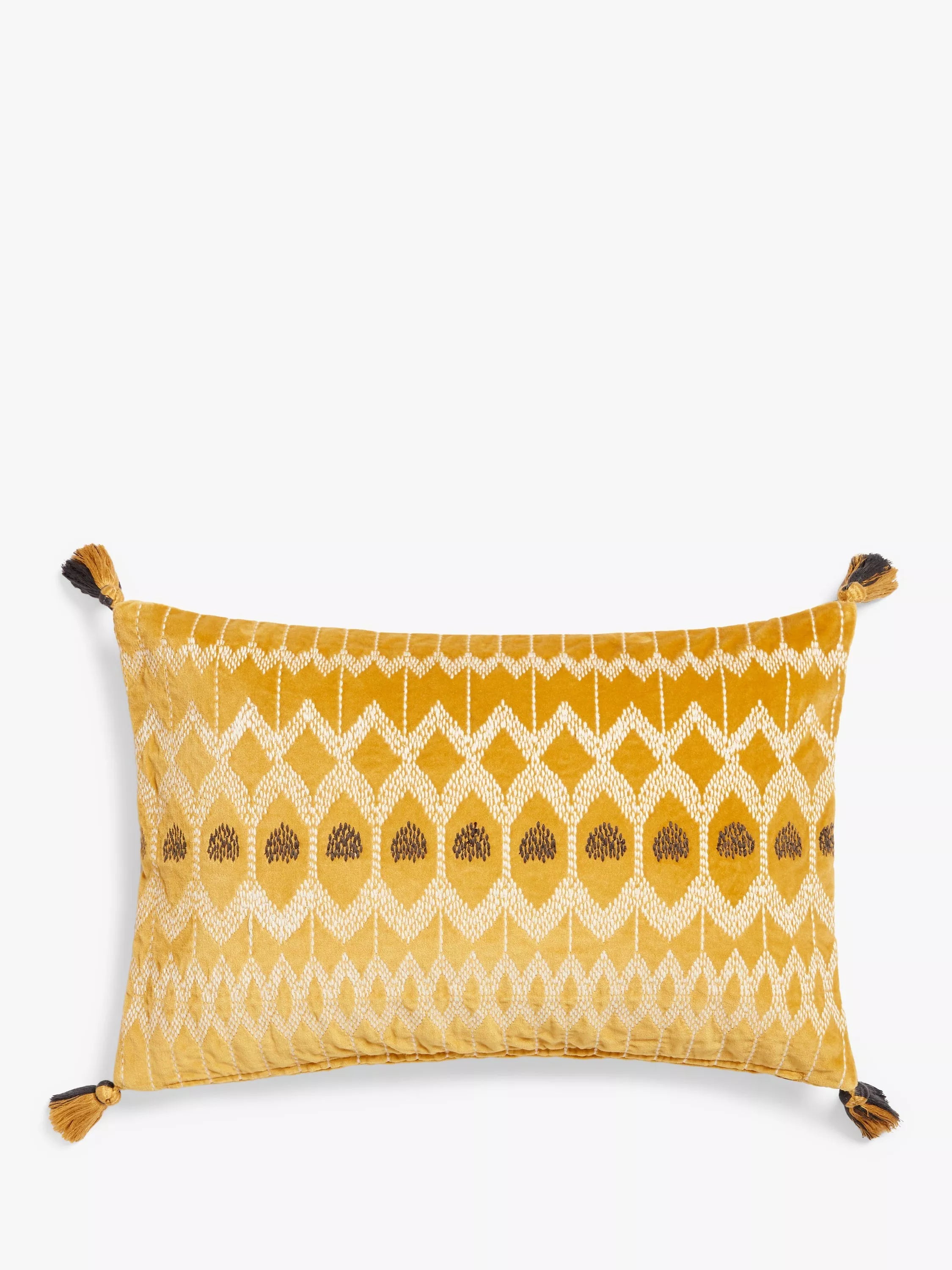 Kuva is an attractive bolster cushion that features machine guided embroidery on a plush velvet background. It's finished with soft tassels at each corner.