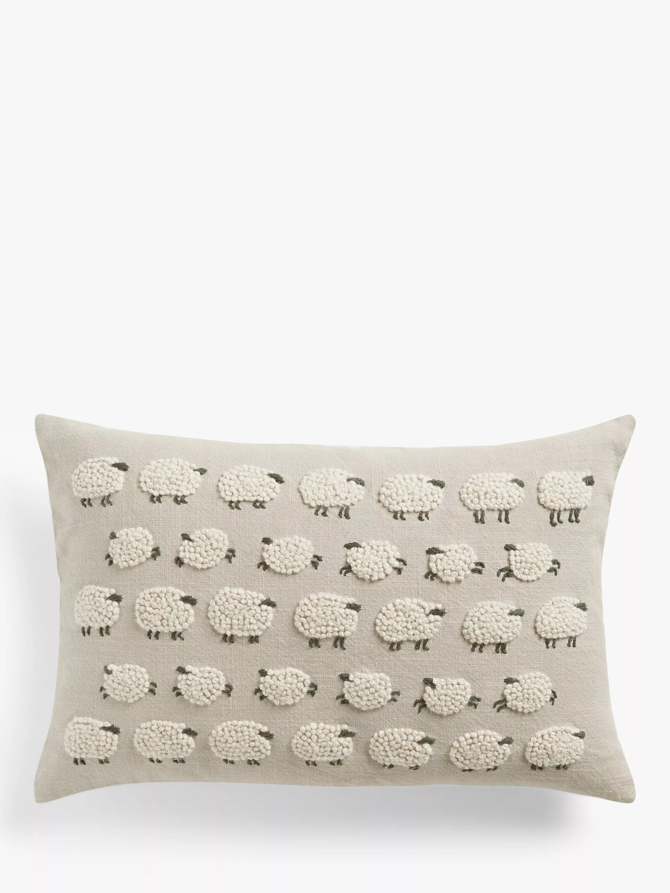 A flock of embroidered bouclé sheep skip over the natural background of this cute cushion.