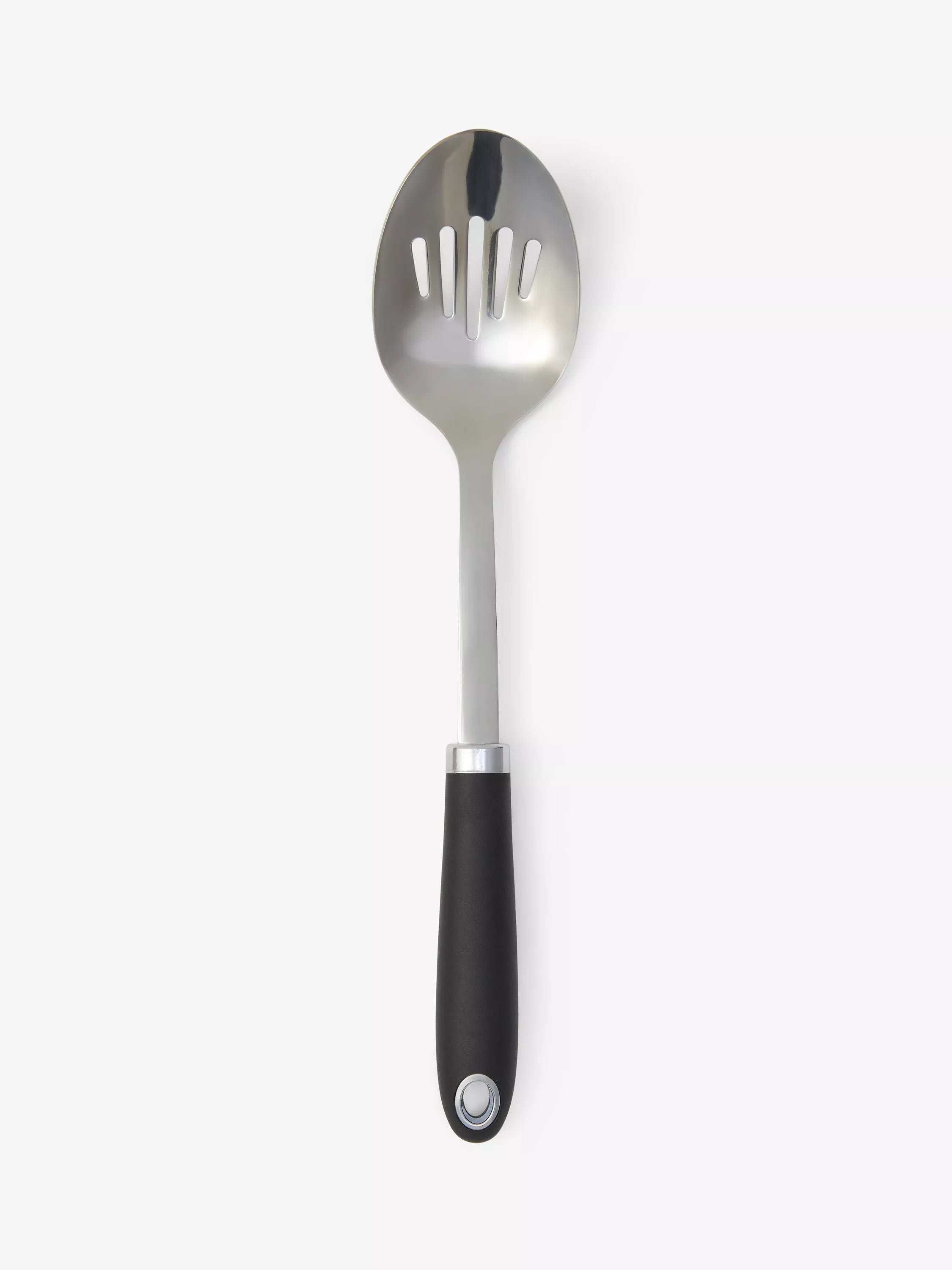 Slotted spoon made of durable stainless steel. Dishwasher safe, it's easy to clean and has a hanging hole for storing. The soft-grip silicone handle makes it comfortable to hold and use.