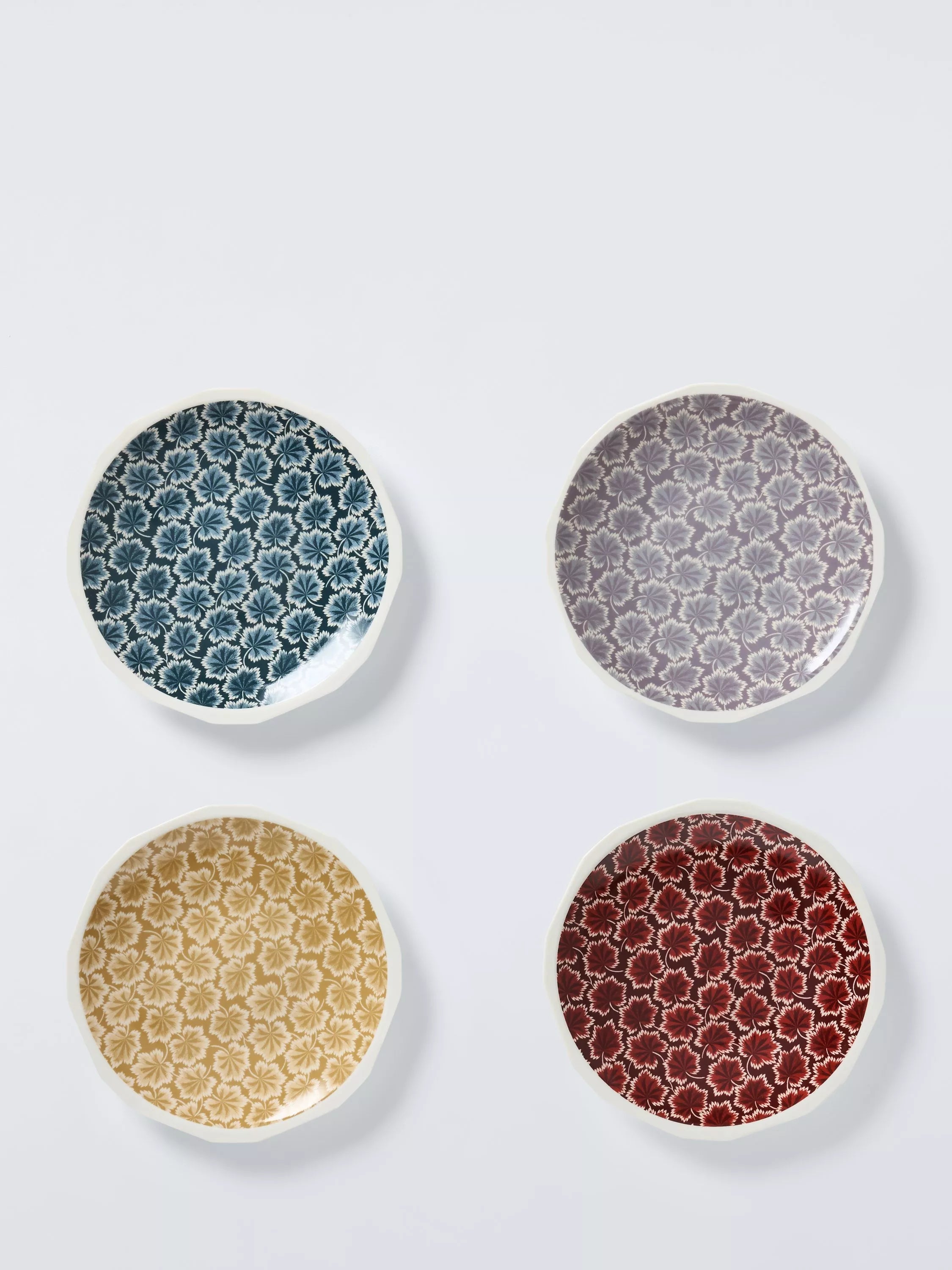 Four side plates in different colours with a fan leaf print. Made of fine china, they're dishwasher and microwave-safe.