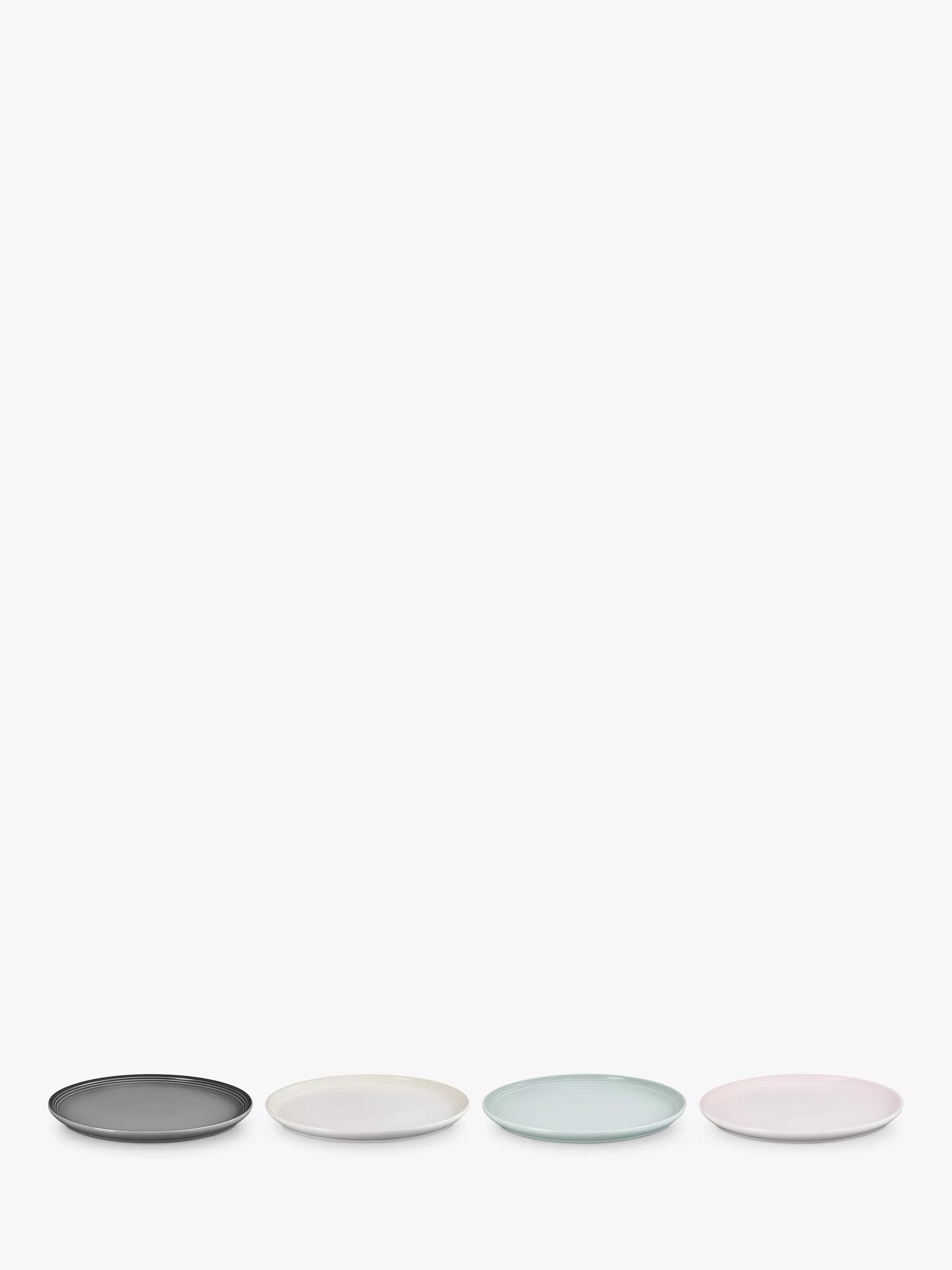 Four Le Creuset stoneware coupe side plates in four different trend colours: Flint, Sea Salt, Shell Pink and Meringue.