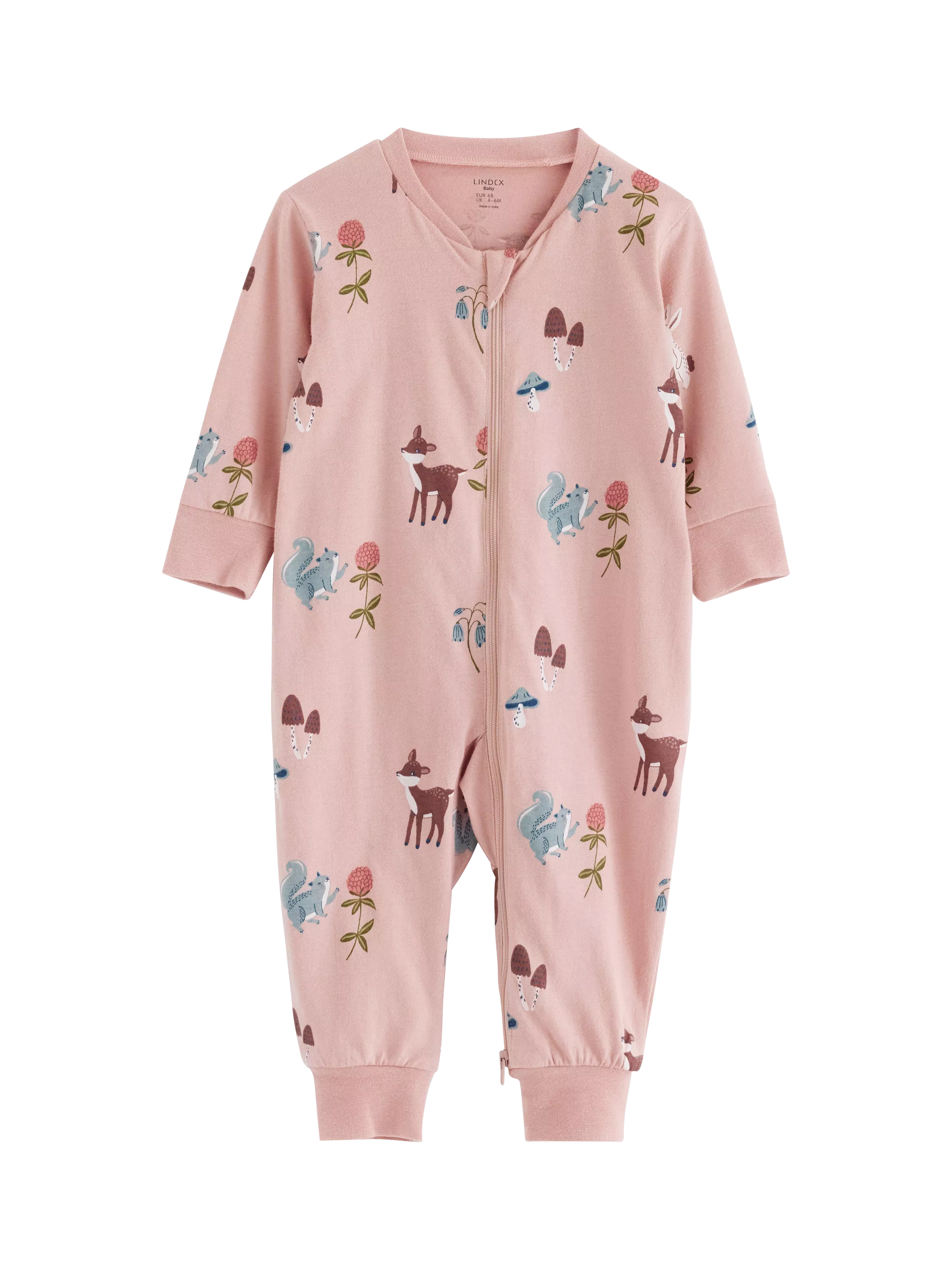 A printed long sleeve organic cotton sleepsuit. Designed with a two-way zip to make dressing and nappy changes easier.