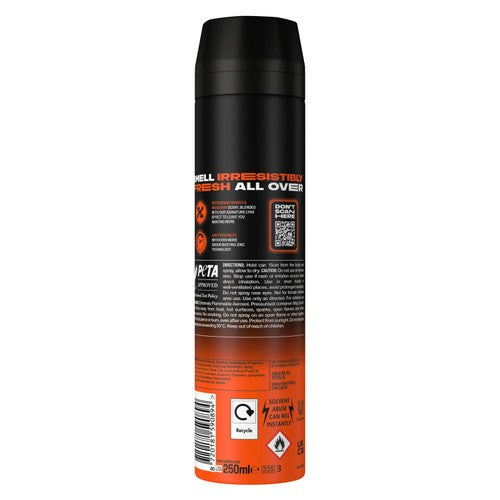 Logo "SOLVENT ABUSE CAN KILL INSTANTLY",EU Logo UKCA Conformance MarkEU All Over Body Deodorant Aerosol DIRECTIONS: Hold can 15cm from the body and spray, allow to dry. CAUTION: Do not use on broken skin. Stop use if rash or irritation occurs. Avoid direct inhalation. Use in short bursts in well-ventilated places, avoid prolonged spraying. Do not spray near eyes. Not for female intimate area use. Use only as directed. For external use only. DANGER: Extremely Flammable Aerosol. Pressurised container: May burst if heated. Keep away from heat, hot surfaces, sparks, open flames and other ignition sources. No smoking. Do not spray on an open flame or other ignition source. Do not pierce or burn, even after use. Protect from sunlight. Do not expose to temperatures exceeding 50°C. Keep out of reach of children..