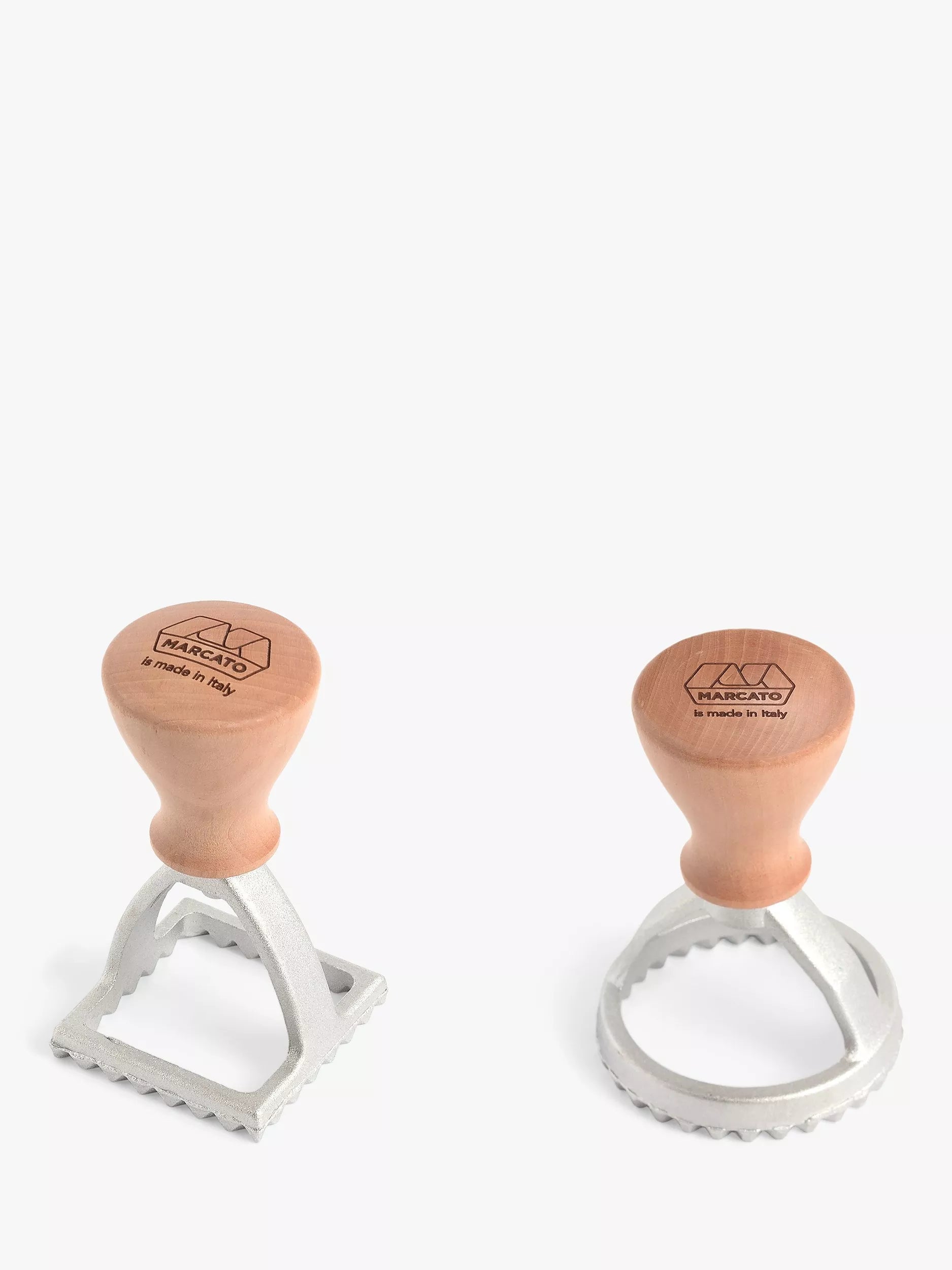 Raviolè gift-boxed kit including two Marcato classic ravioli stamps: square 58mm and round 58mm. The wood chosen for these stamps is pear wood, which is hard and compact to ensure durability.