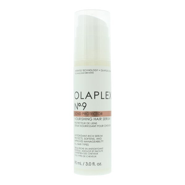 No.9 Bond Protector Nourishing Hair Serum, from Olaplex, used on damp hair nourishes, repairs and protects your hair. Provides heat protection for your hair and reduces tangles and static. It improves your hairs memory to keep the bounce in your curls. Protects against pollution and neutralizes free radicals. Vegan friendly.