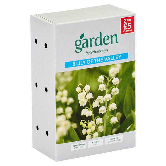 Garden by Sainsbury's supplies five Lily of the Valley bulbs intended for immediate planting success this coming spring season now. These classic springtime flowers offer highly scented, delicate white blossoms reaching twenty centimetres tall easily. Perfect for adding traditional fragrance to shaded garden borders this year for beautiful reliable results.