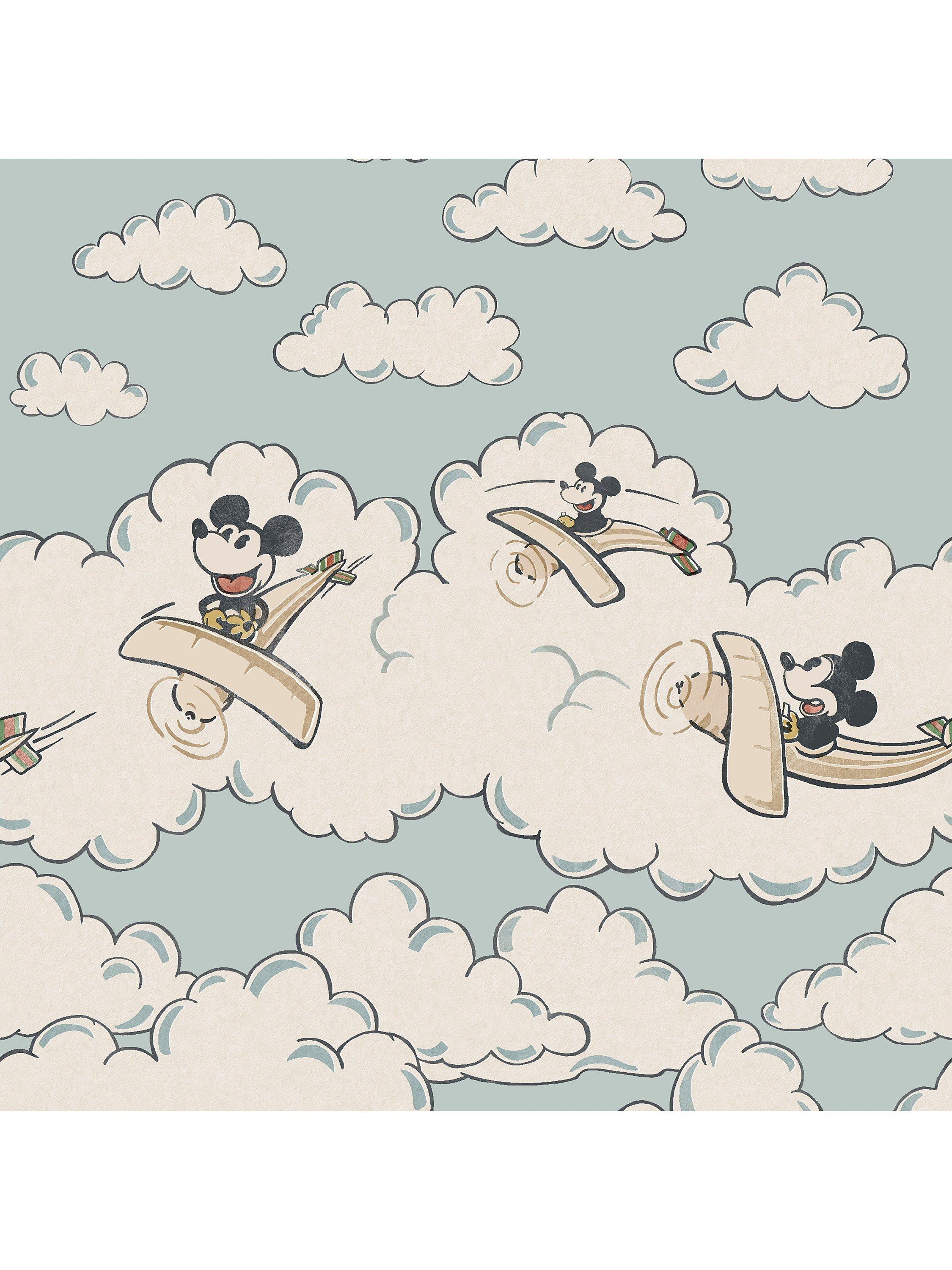 Sanderson presents this charming Mickey In The Clouds Wallpaper Mural Sea Salt, perfectly sized for creating a striking feature wall design. This large decorative panel clearly features Mickey Mouse gliding among beautiful, soft cotton-candy clouds, sourced from archival inspiration. This specific wallpaper offers magical, uplifting beauty for any modern nursery.
