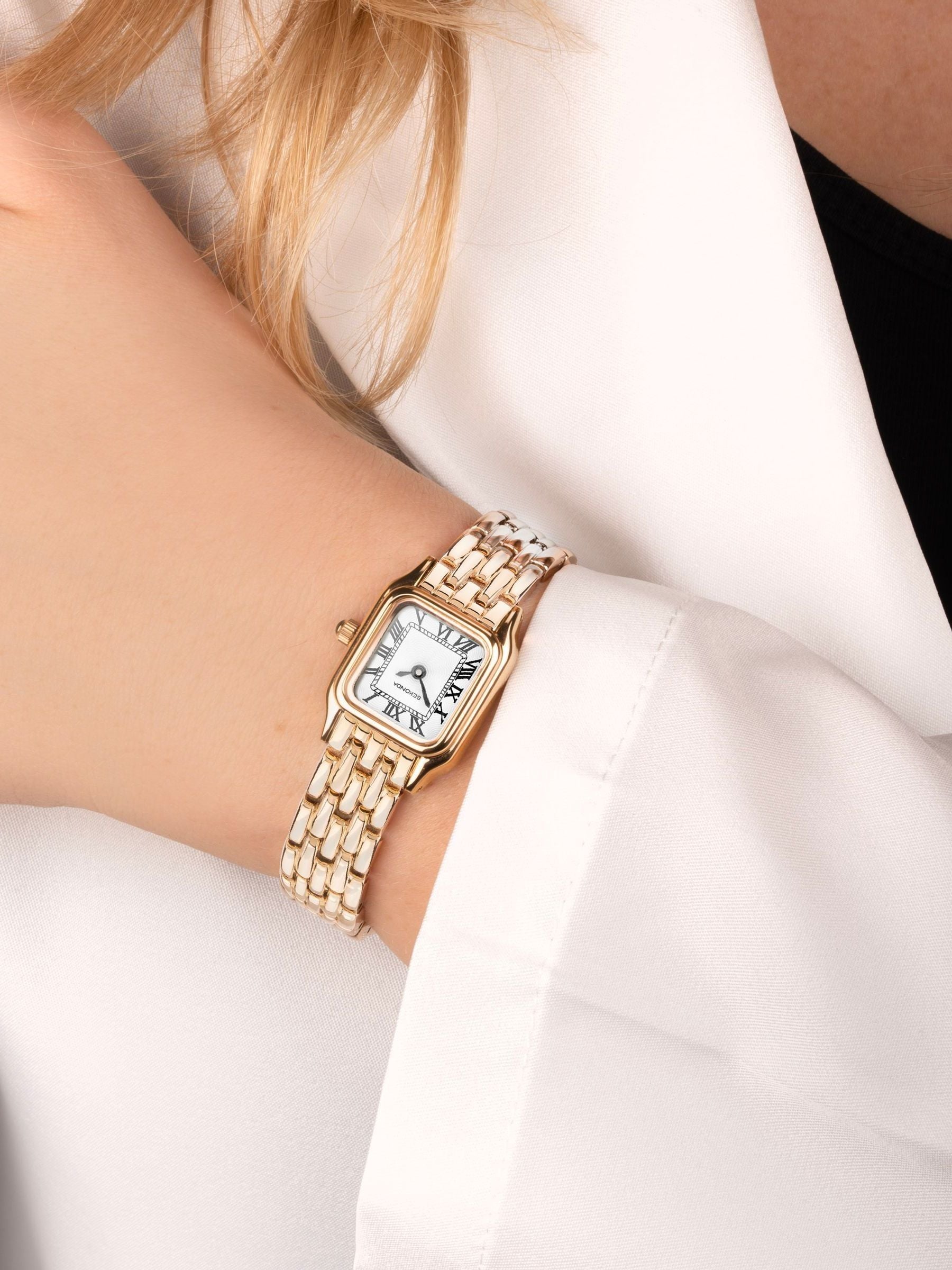 This watch fastens with an ion-plated rose gold tone alloy bracelet. The watch has a square, ion-plated rose gold case enclosing a white dial with black Roman numerals.