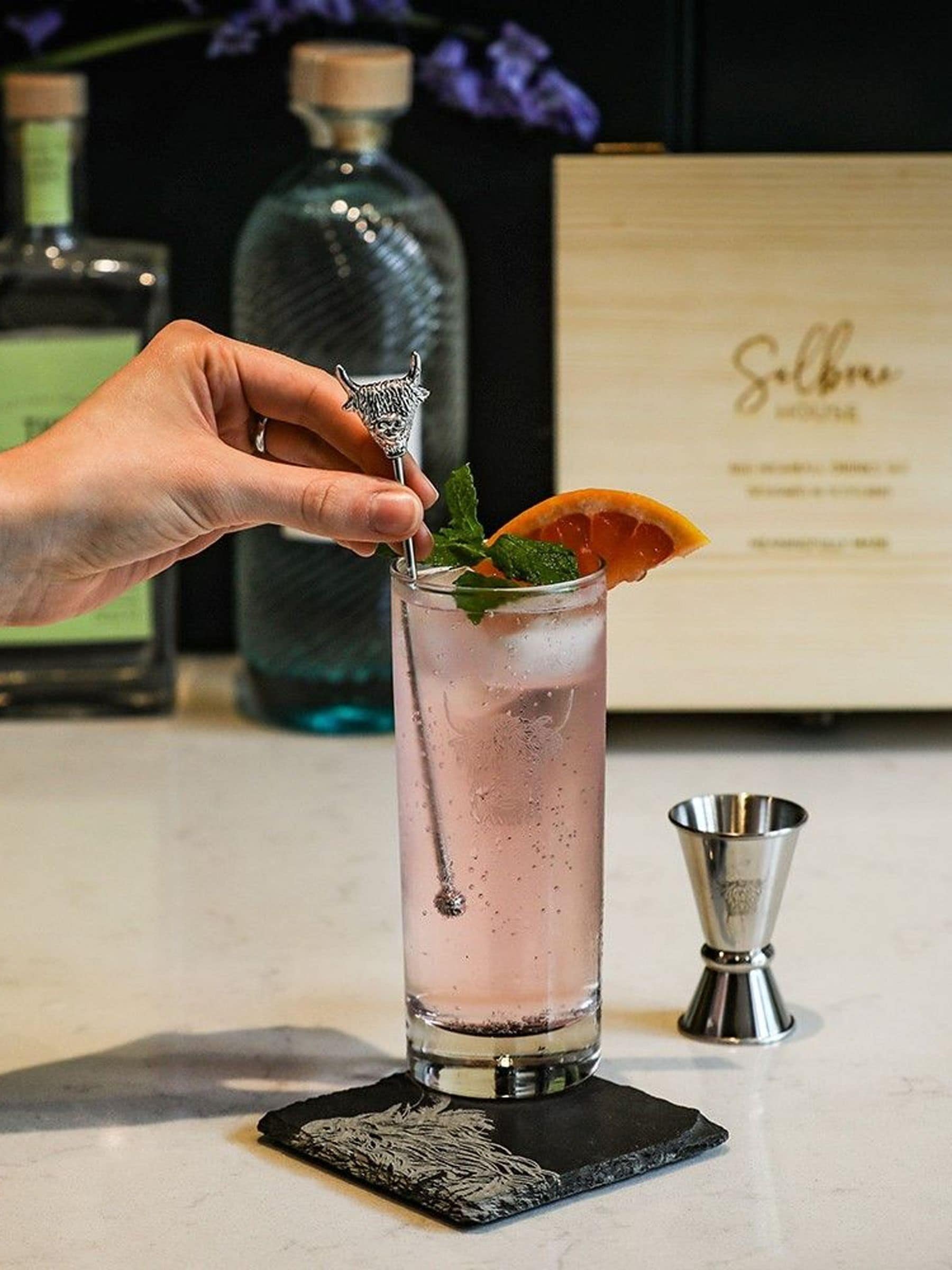 Presenting a highball glass, slate coaster, drinks stirrer, and drinks tipper, all embellished with a charming highland cow design.