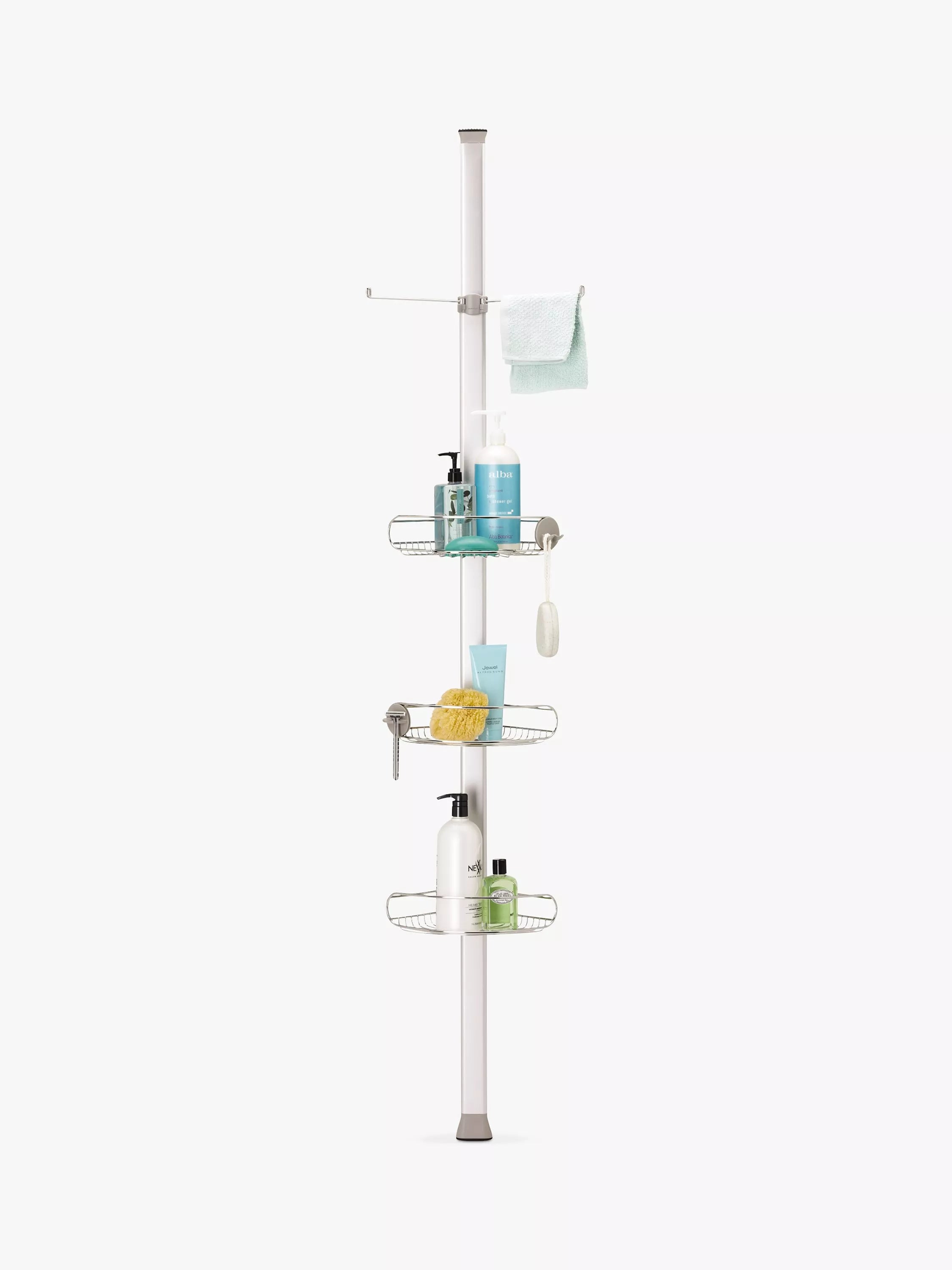 Featuring three adjustable shelves that slide up and down along a sturdy and durable aluminium pole, the set includes extensions and no tools are needed to install it.