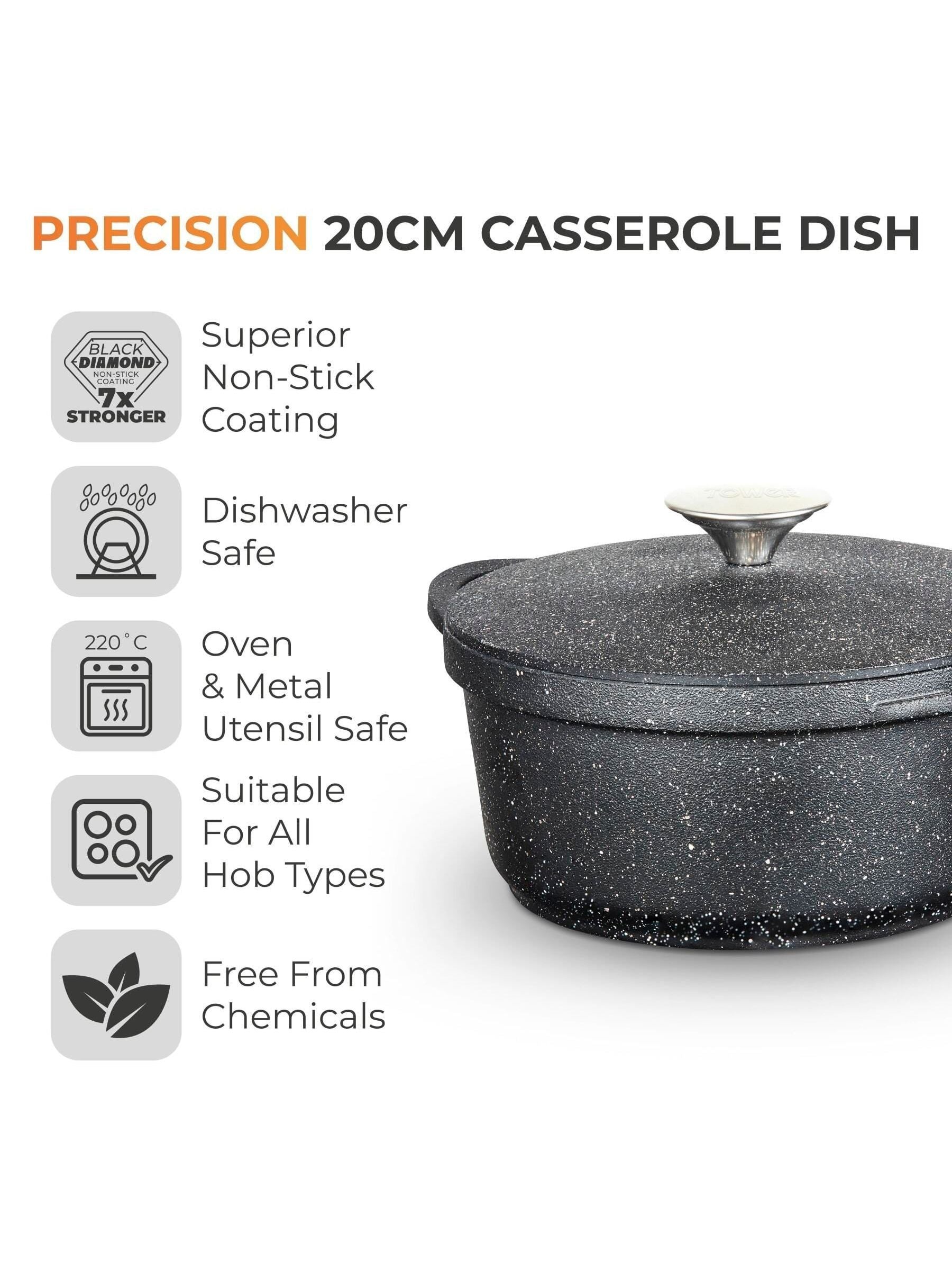 Bring the whole family together for a delicious meal cooked to perfection in this Tower Precision casserole. You can use it to cook on the hob (poaching or stewing) or in the oven (roasting or slow cooking). This versatile aluminium cast casserole is part of TOWER’s superior Precision collection. The domed aluminium cast lid is designed to retain moisture during cooking to ensure perfect results. Made from cast aluminium, the casserole is lightweight, yet has robust properties that are strong and hardwearing. The internally applied Black Diamond non-stick coating is seven times stronger than standard non-stick coatings. It prevents food from sticking, making for an effortless cooking experience. You can even use metal utensils without causing damage due to their high abrasion resistance. While suitable for use in the oven withstanding temperatures of up to 220°C, this casserole dish can also be used in the fridge, the freezer and in the dishwasher.. HIGH QUALITY CAST ALUMINIUM: 20cm Casserole dish with lid made from high-quality, lightweight cast aluminium for long-lasting quality and greater durability. Enjoy mouth-watering slow-cooked meats and tasty one-pot stews. Poach or stew on the hob, or roast and slow cook in the oven, with the aluminium domed lid retaining all the moisture for succulent results, every time. BLACK DIAMOND NON-STICK COATING: This casserole dish features our superior Black Diamond non-stick coating that is 7 times stronger than other cookware coatings. The infused, dual-layer coating requires little to no oil, with Nano-Crate Technology for even oil coverage, letting you cook healthier, low-fat meals. SUITABLE FOR ALL HOB TYPES: Conveniently easy to carry from hob to oven to table. Suitable for all hob types, including induction hobs and safe to use in ovens up to 220°C. The bonded steel base ensures fast and even heat distribution, so there are no hot spots when you’re cooking. OVEN & METAL UTENSIL SAFE: Withstands high cooking temperatures and is safe for use in the oven up to 220°C. The superior coating properties allow for the use of metal utensils, safeguarding against accidental scratching. 10-YEAR GUARANTEE: Trusted Tower quality with a standard 1-year guarantee and 9-year extension, subject to product registration online.