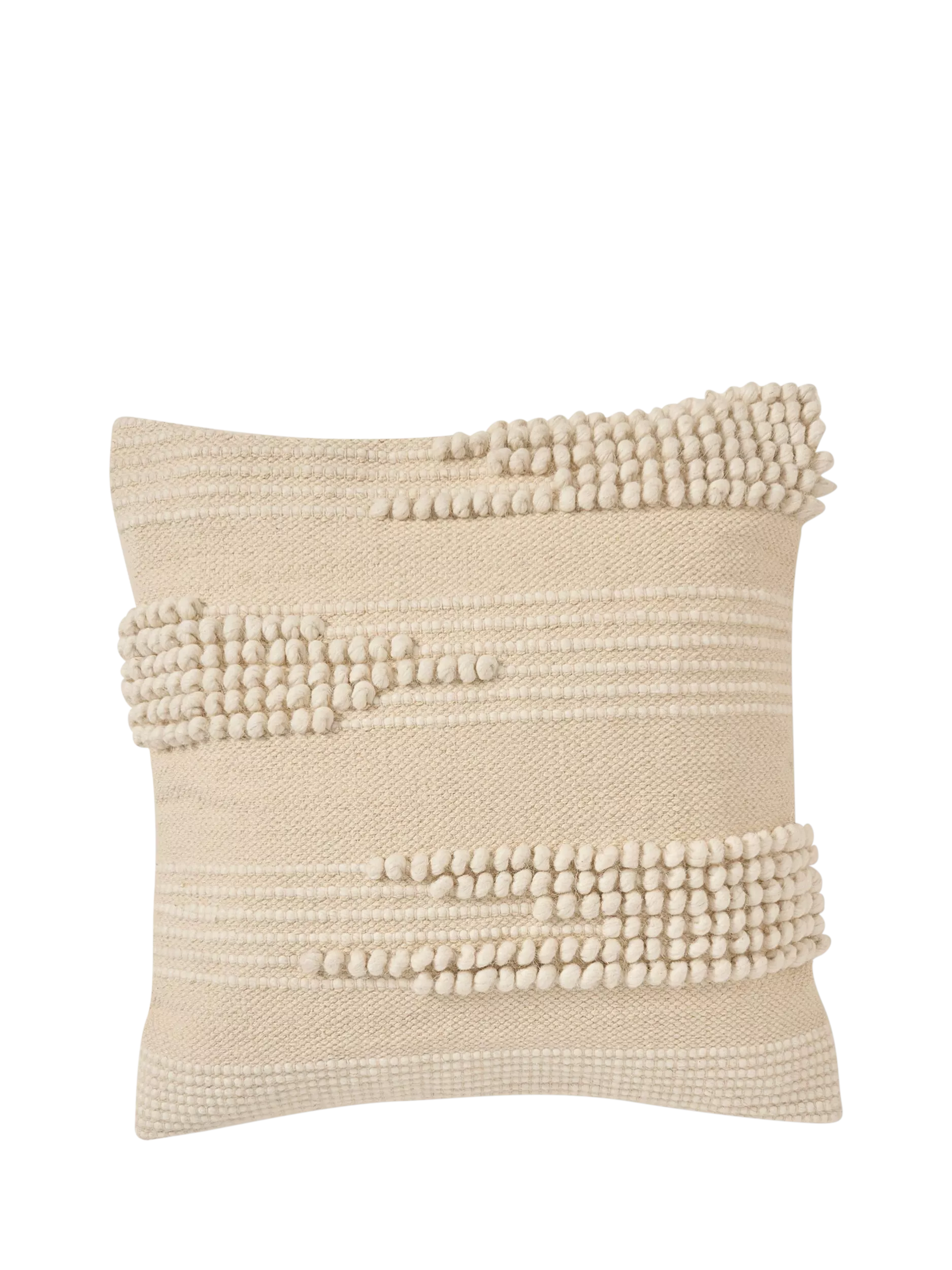 Crafted from a luxurious blend of wool and cotton, this cushion features an intricate knotted design that adds depth and character to any room. The feather-filled cushion pad ensures plush comfort, while the concealed zip allows for easy removal and machine washing of the cover.