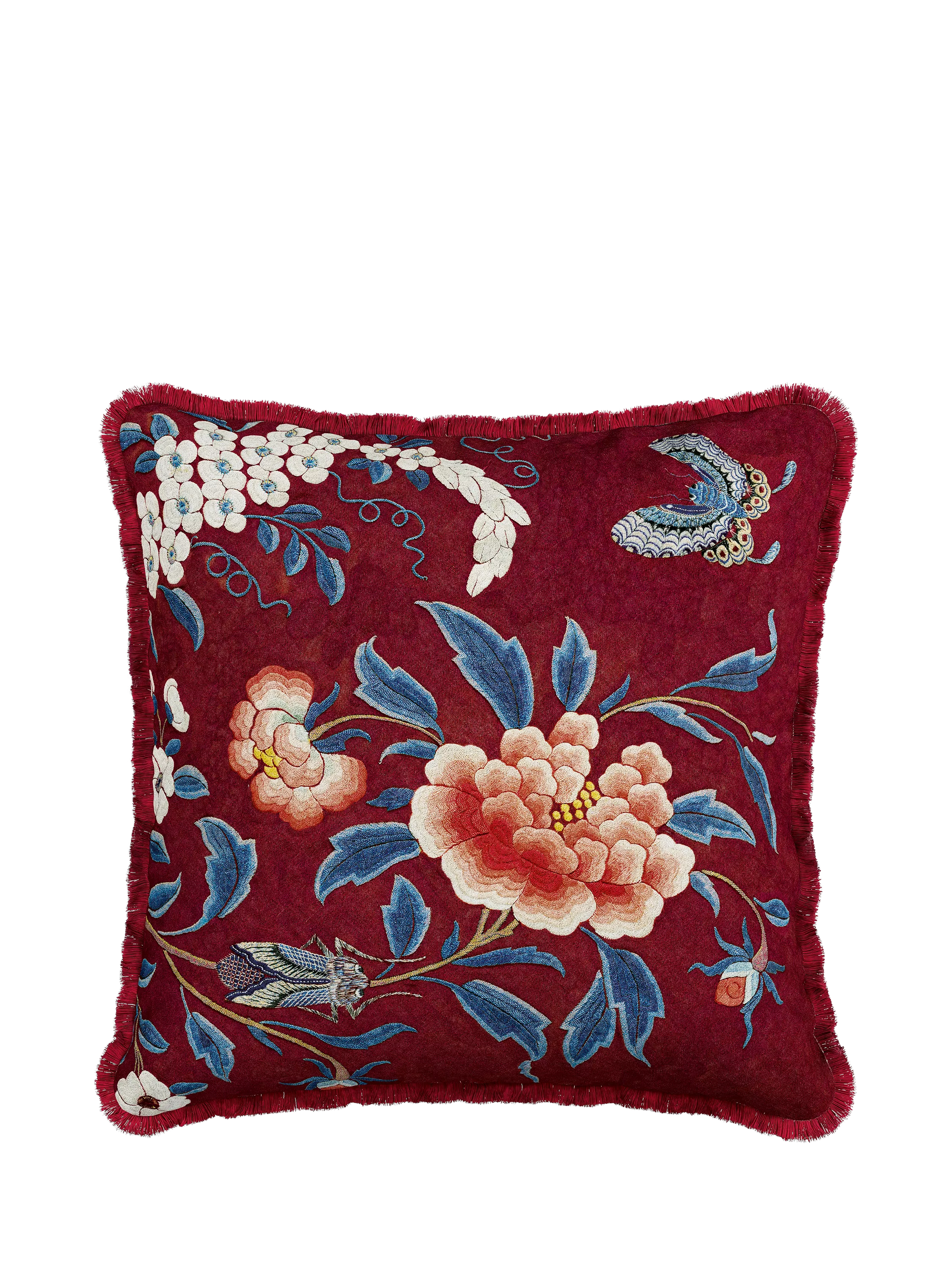 This cotton cushion features a detail from a silk shawl in the V&A collection which was embroidered between 1870 and 1920 in China with fantastical plants, animals and insects for the Western market.